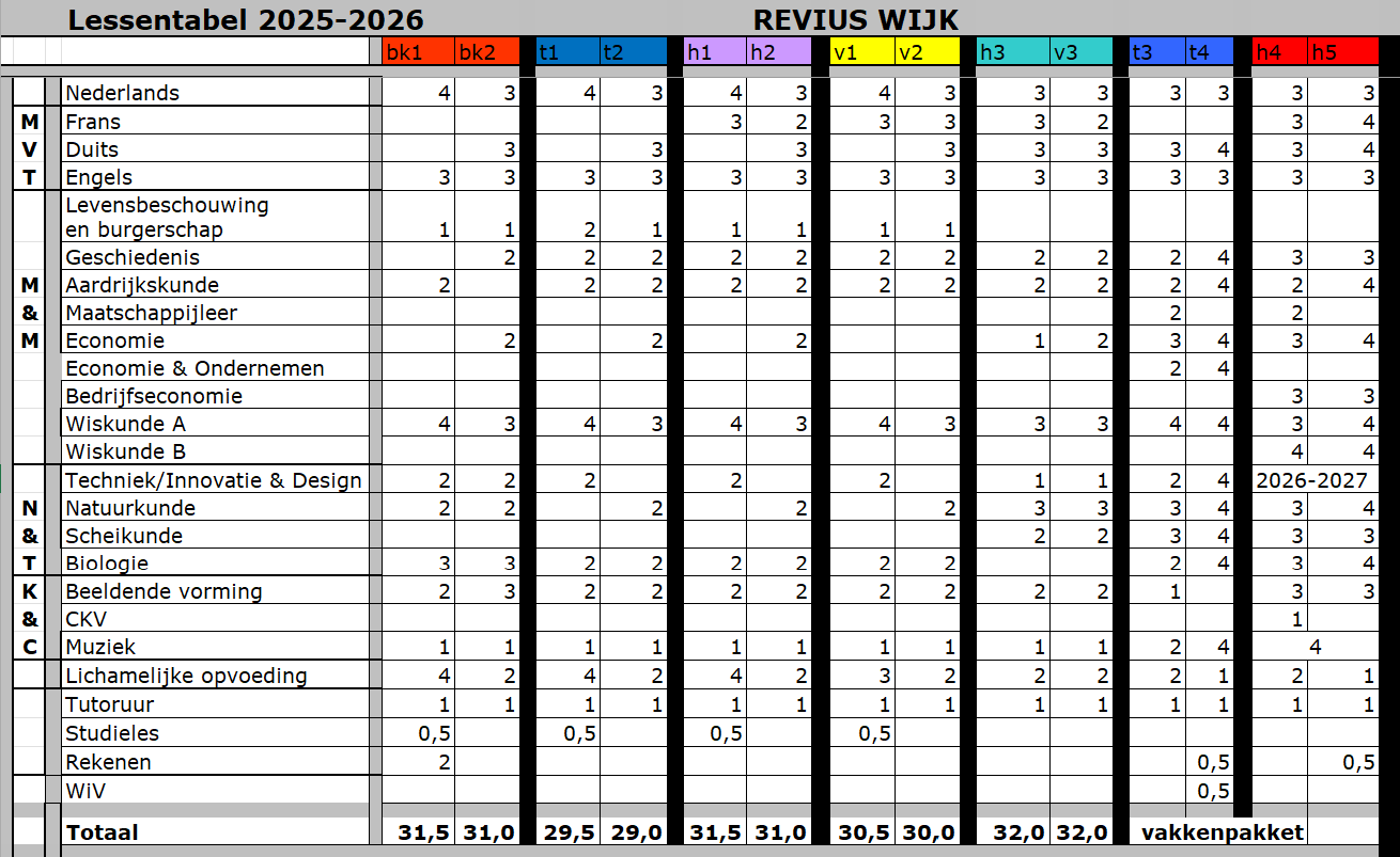 Op Revius Wijk bieden we een heleboel verschillende vakken aan. Als je wil weten welke vakken er gegeven worden in een bepaald leerjaar, dan kun je het overzicht bekijken in de lessentabel. Twee bijzondere vakken op de lessentabel zijn Innovatie & Design (ID) en Economie & Ondernemen (EO). Lees meer via deze pagina.